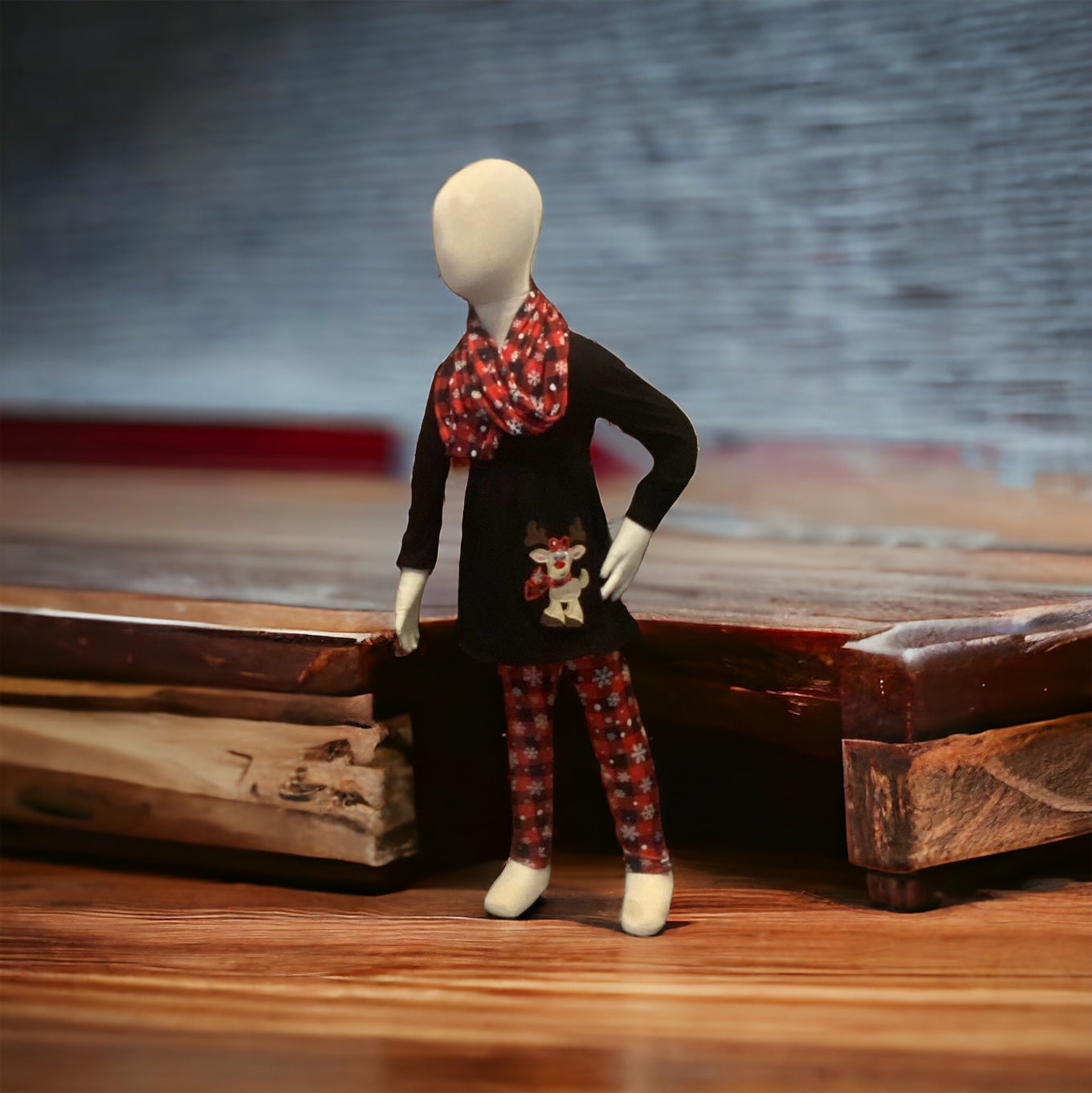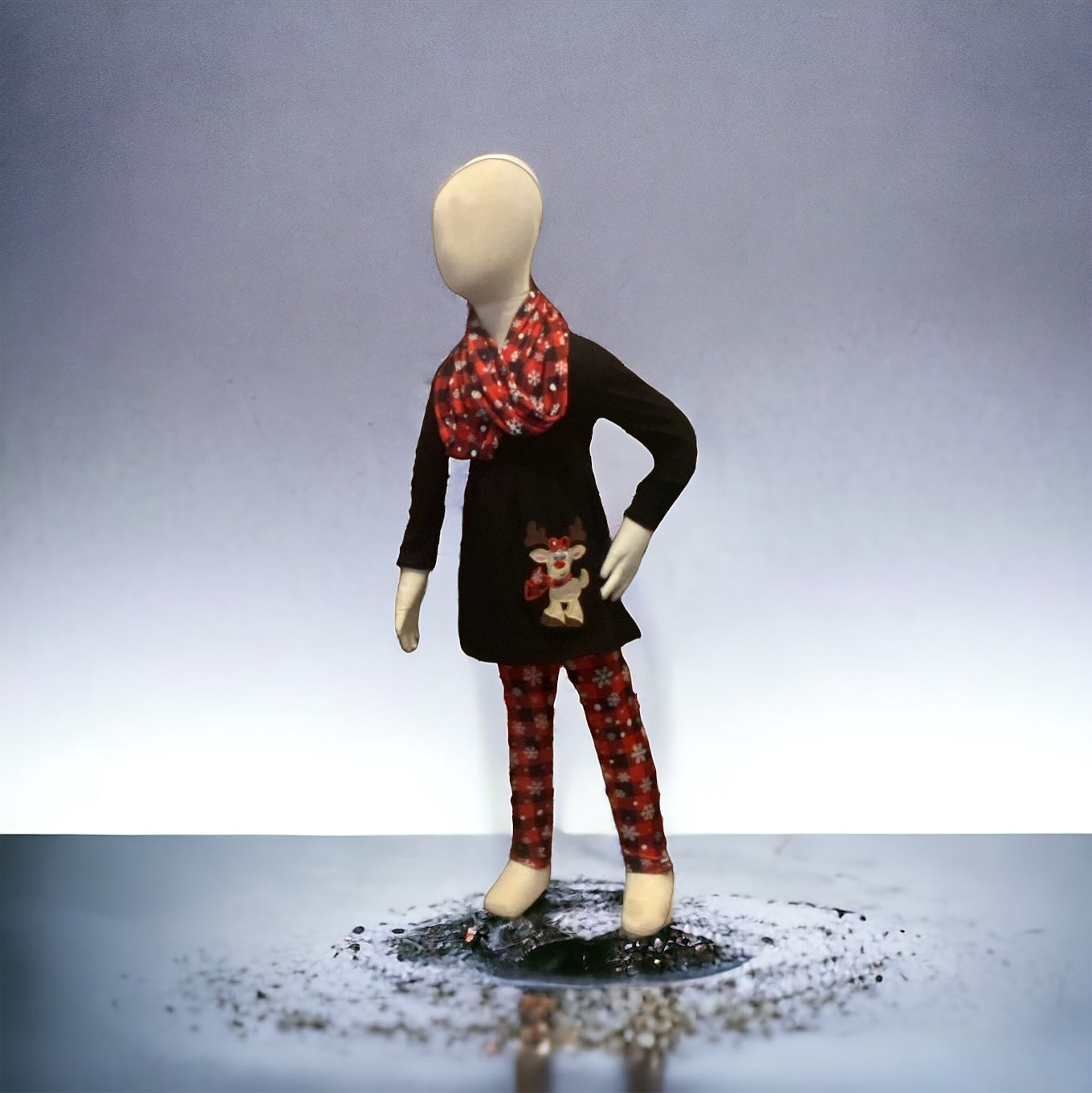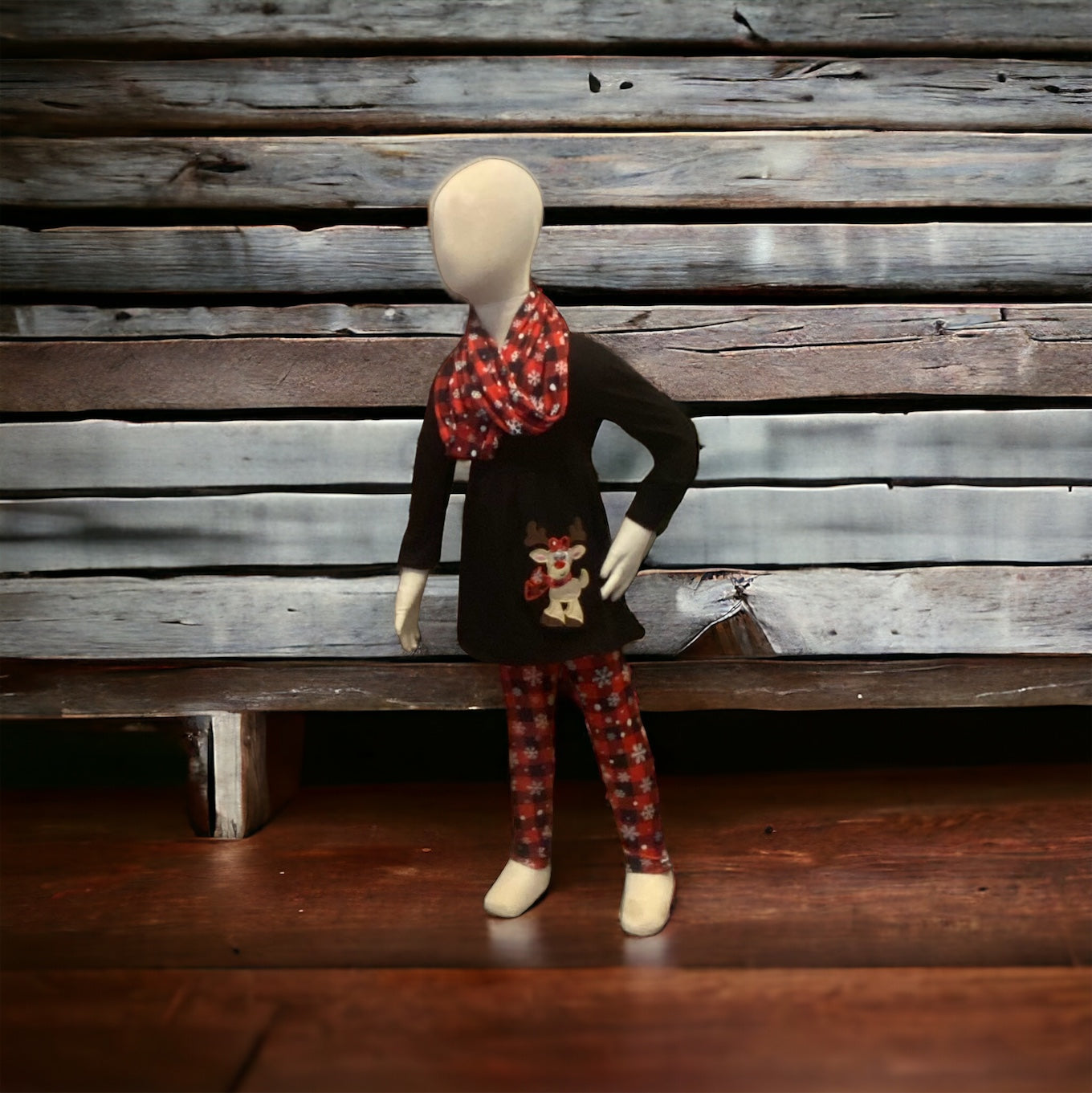 Introducing our 3 piece reindeer set - a black and red ensemble that includes a top, leggings, and scarf. Made with quality materials, this set is perfect for adding a touch of holiday charm to your wardrobe. Stay cozy and stylish this winter with our reindeer set.