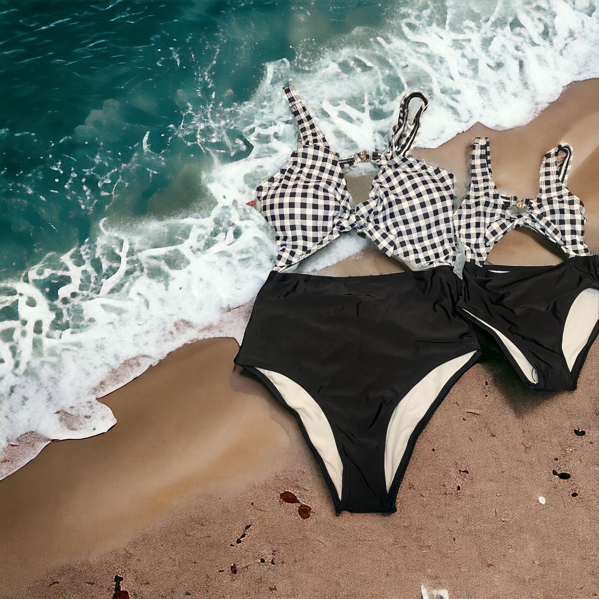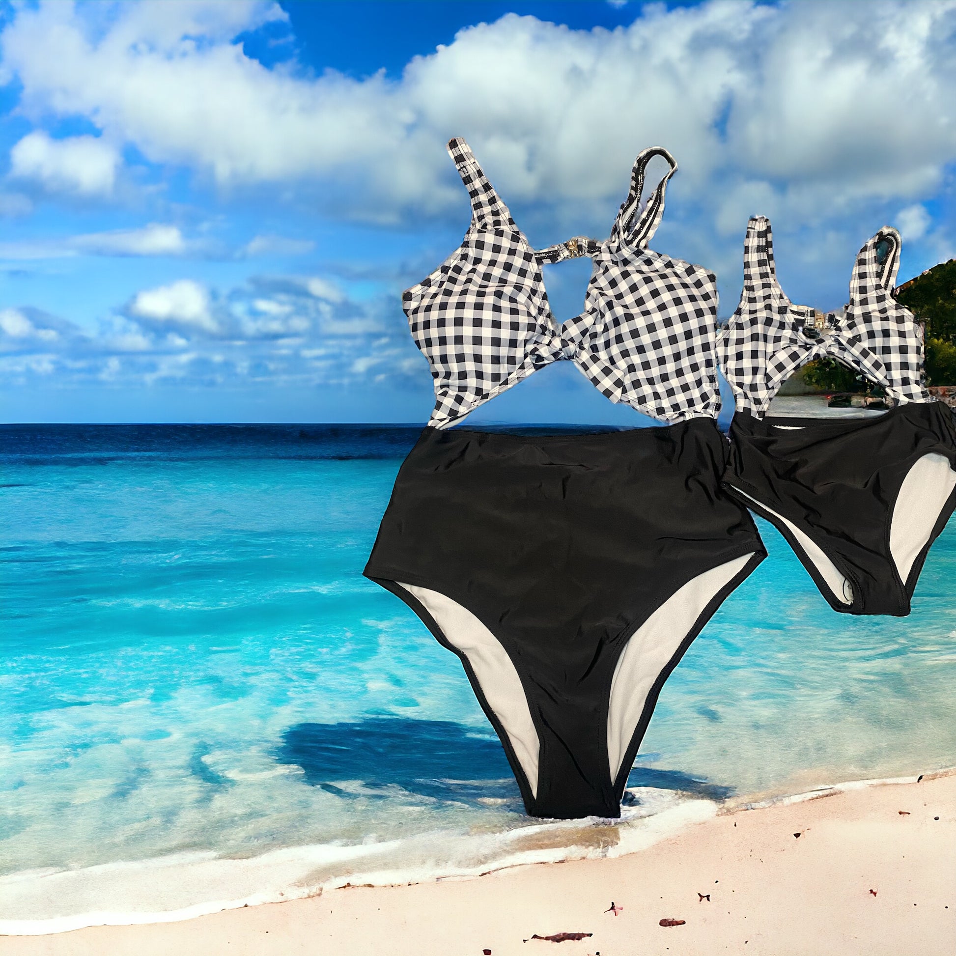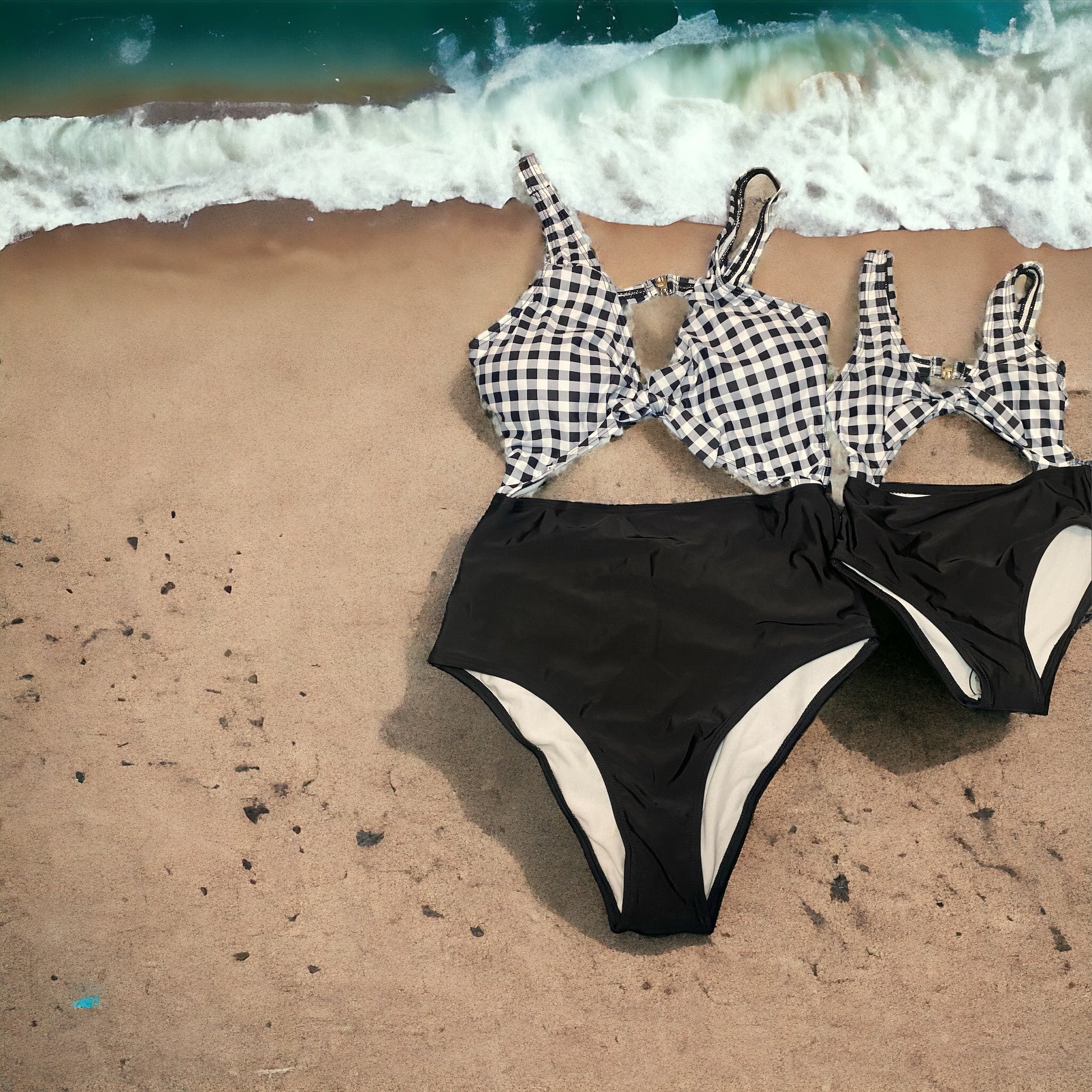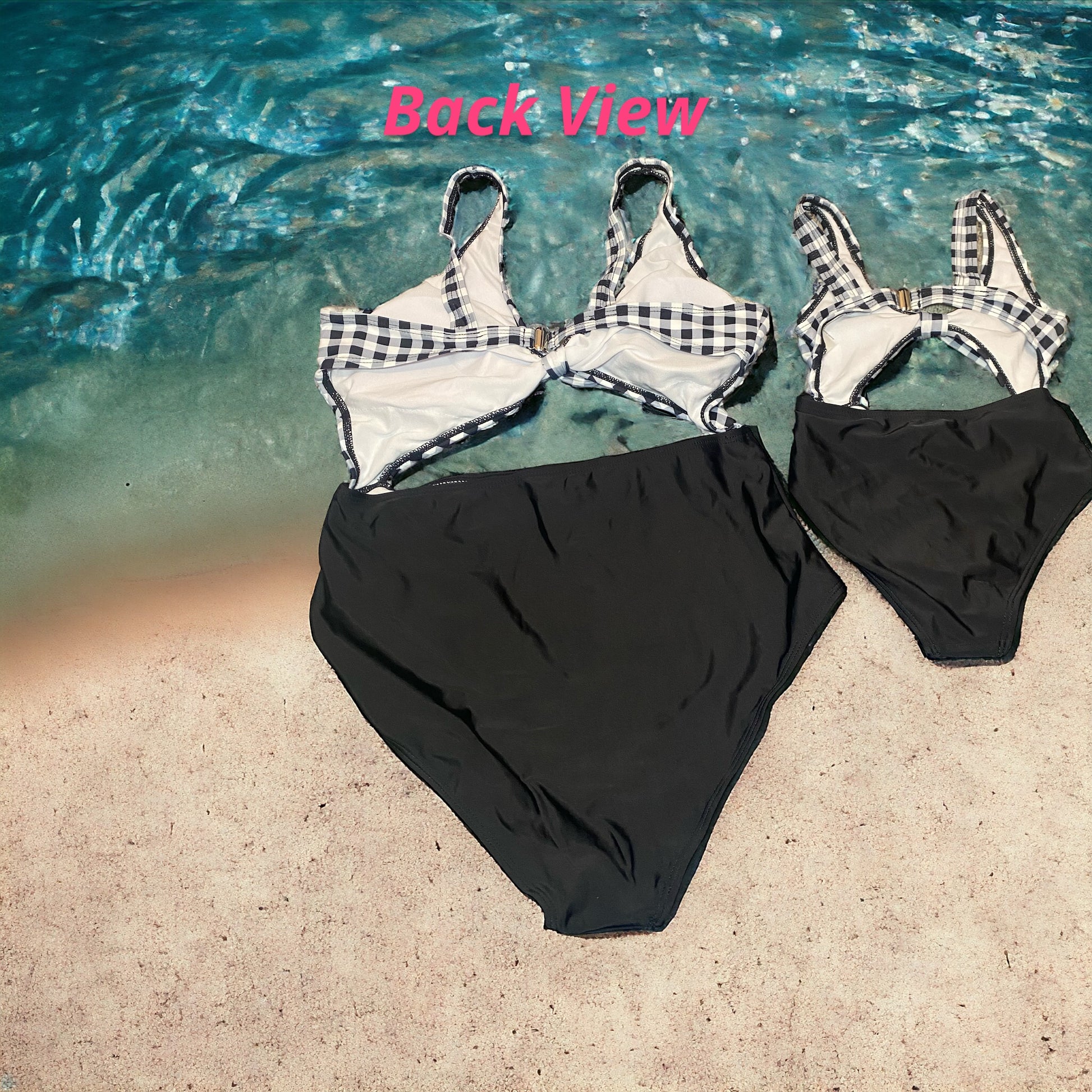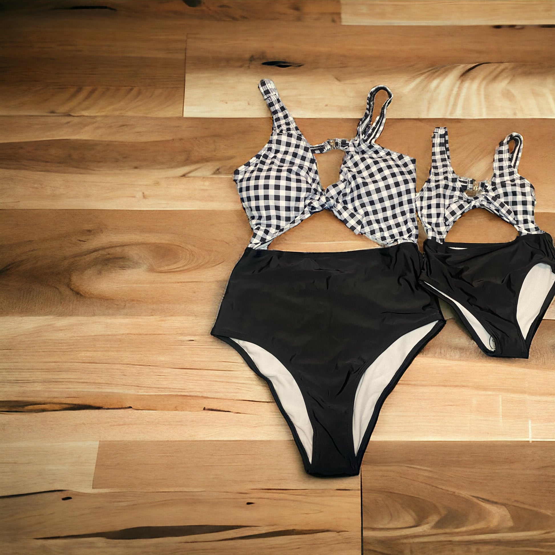 Elevate your beach style with our black and white one piece swimsuit. Perfect for fashionable moms and their little ones, this swimsuit features removable pads for personal comfort in the adult version. The front tie knot and back closure add a stylish touch. Matching looks for both mother and child.