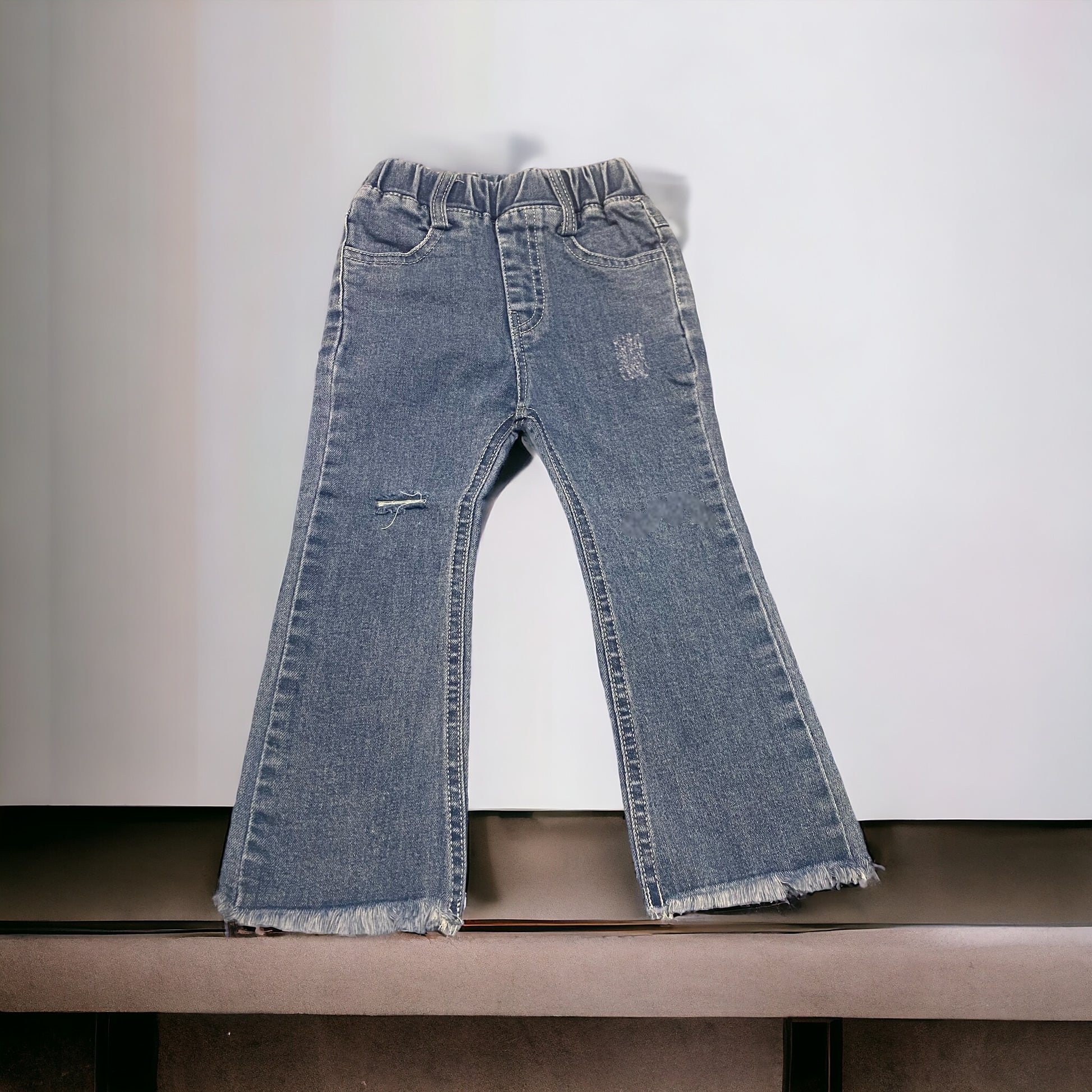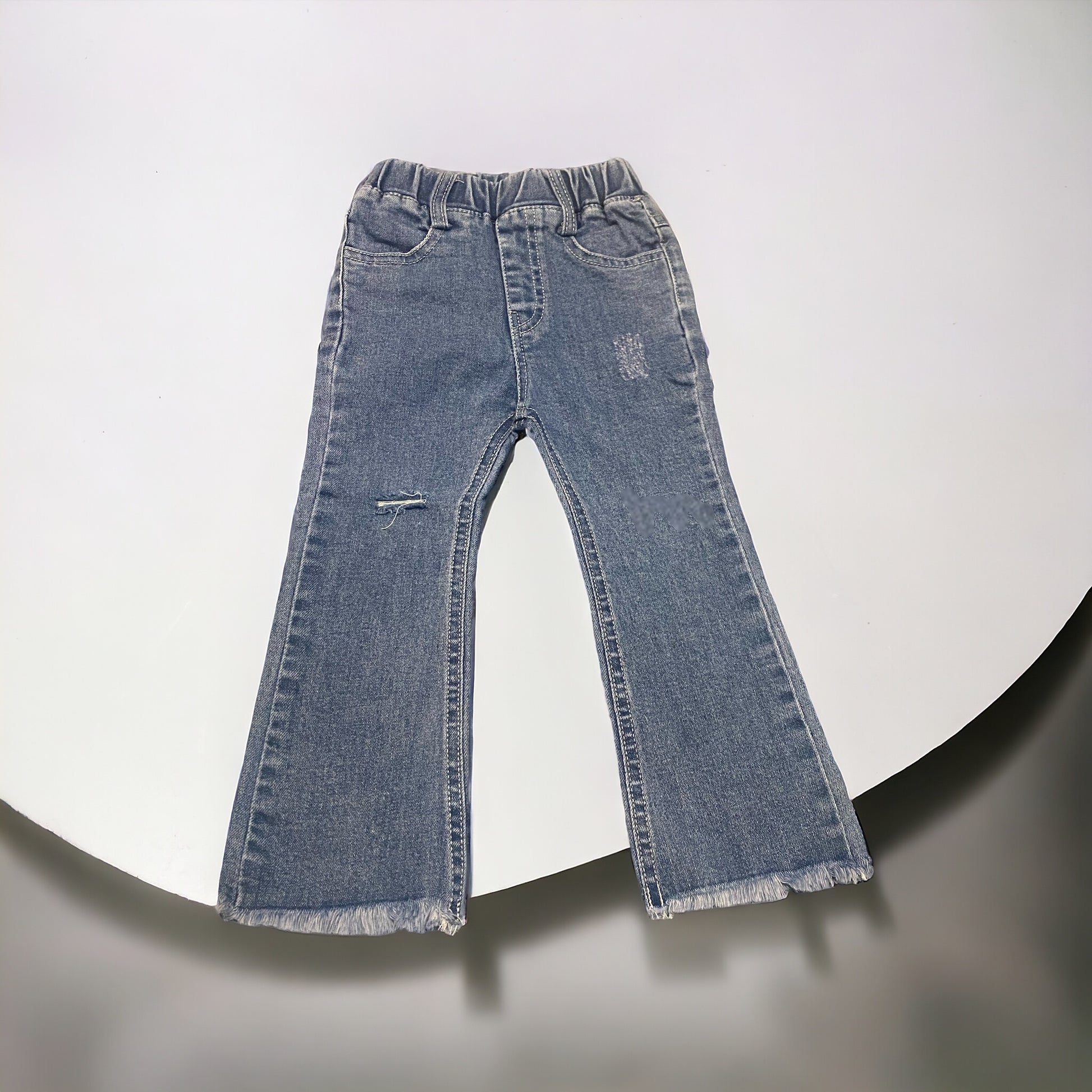 "Embrace style with our Flared Distressed Fringe Bottom Jeans by Billie jeans. With their trendy design, your child will effortlessly make a statement when paired with any top. These jeans provide both fashion and comfort, making them an essential addition to any wardrobe. Upgrade your little one's style game today!"