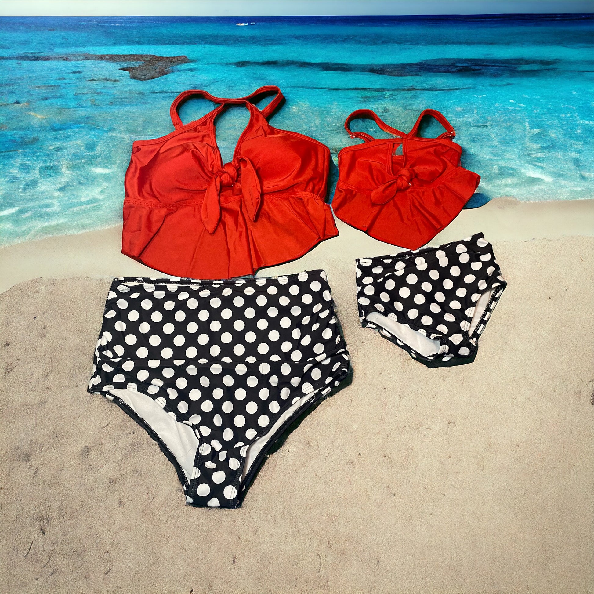 "Dress to impress with our Mommy and Me Matching 2 piece red, white, and black swimsuit. Featuring a stylish red top with tie knot adjustable straps and removable pads, along with a trendy polka dot black and white high waist bottom, you'll be sure to turn heads at the beach. Get ready for a day of fun in the sun with your little one!"