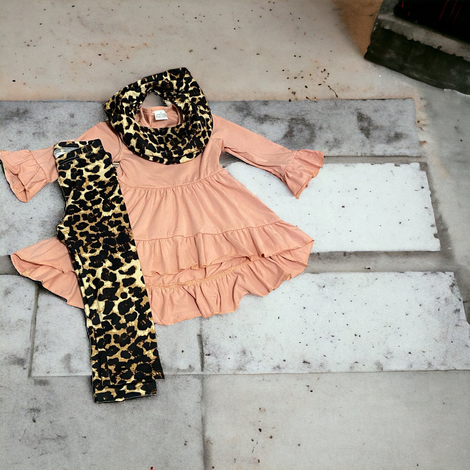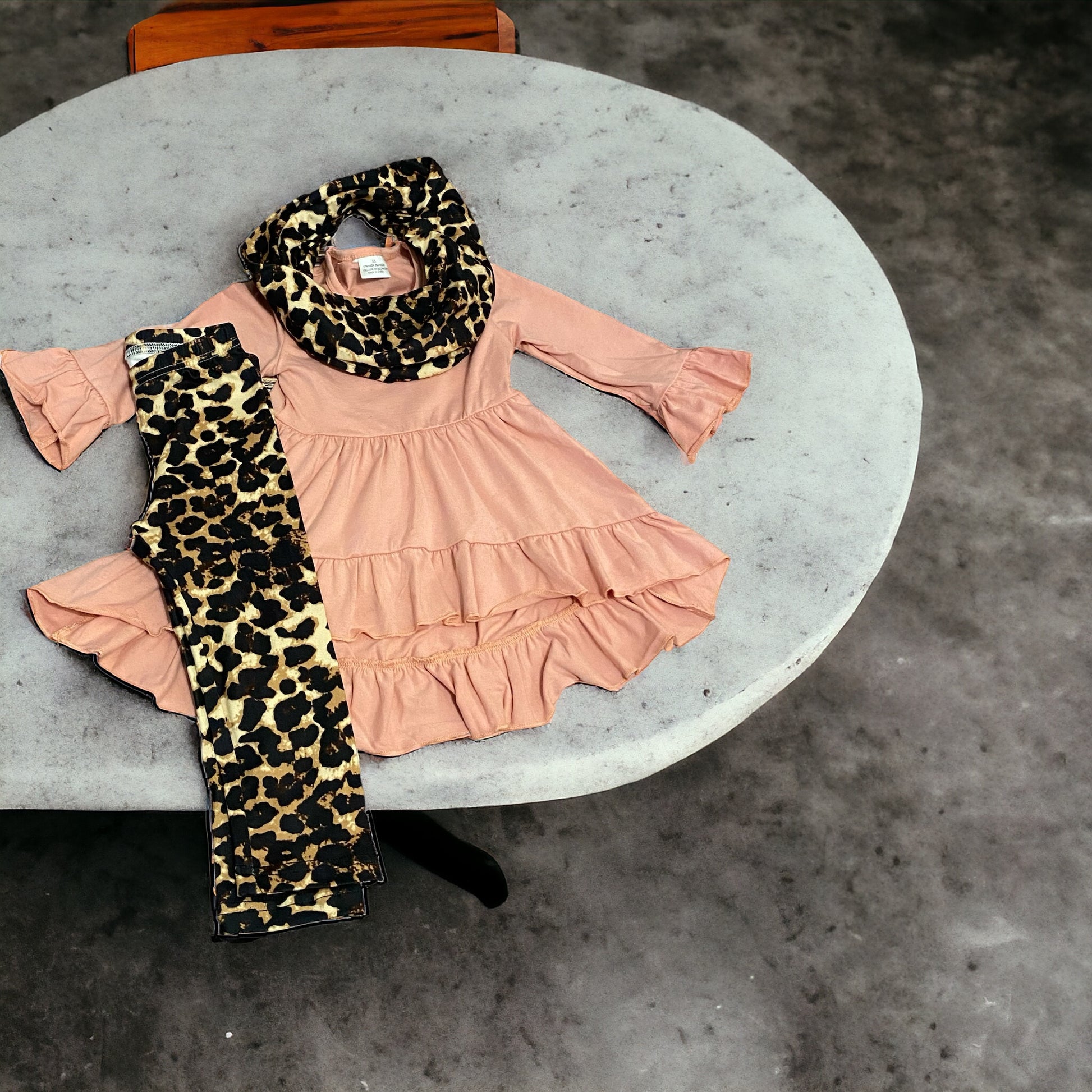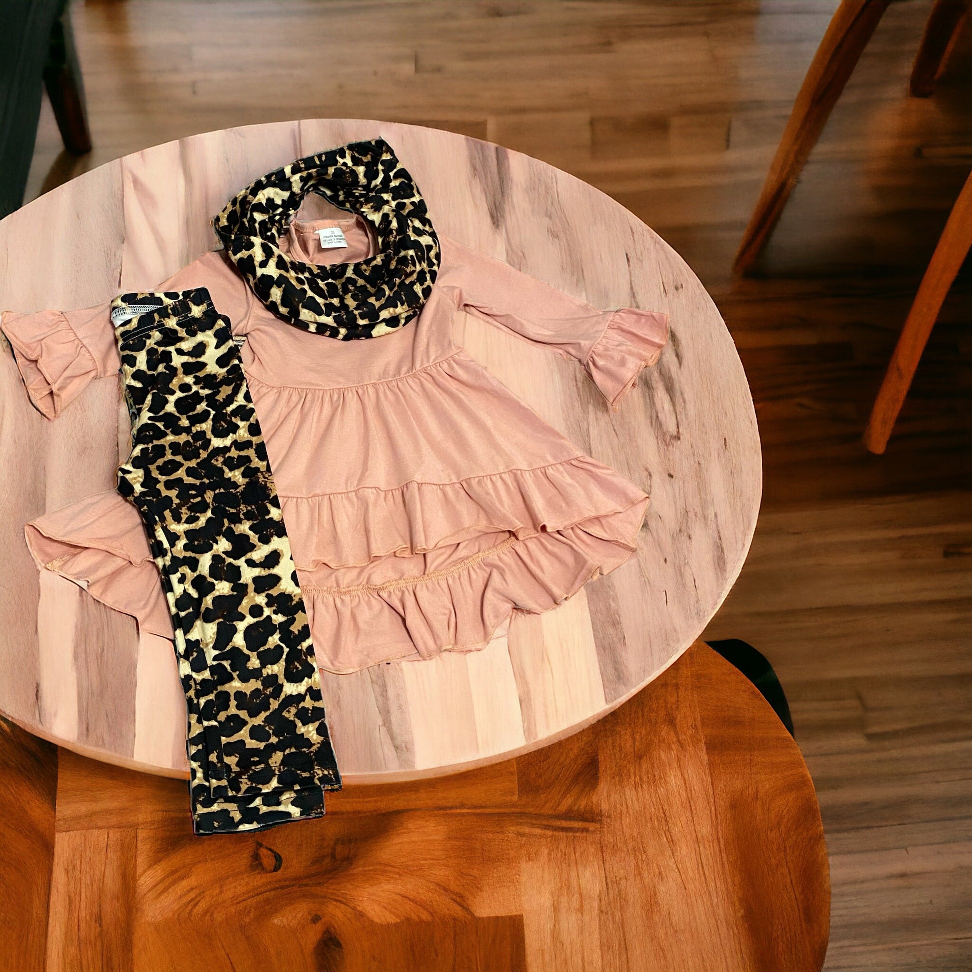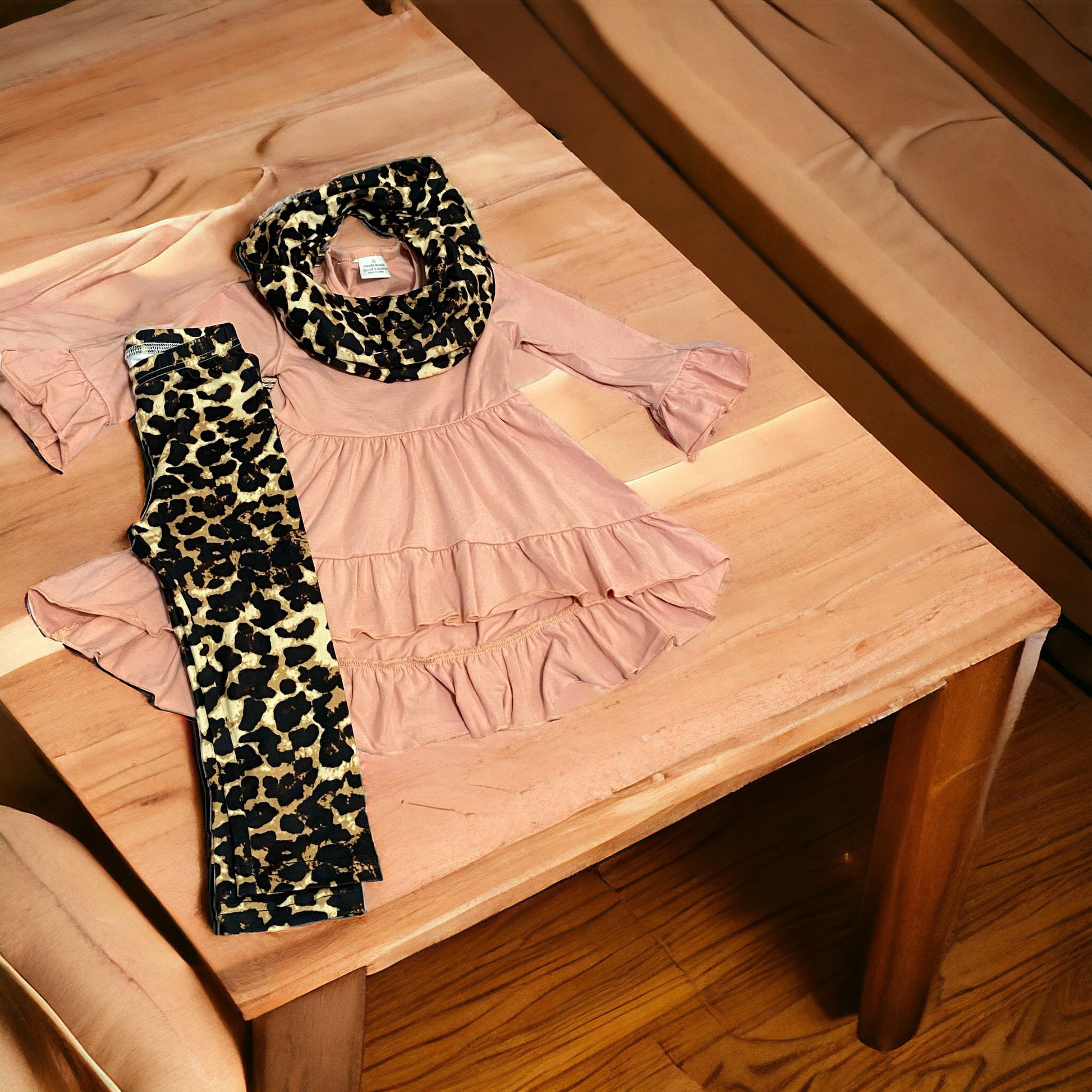 Discover the perfect combination of style and comfort with our Pink and Leopard High Low 3 Piece Set. Featuring a beautiful high low ruffle shirt, scarf, and leggings, this set will elevate your wardrobe with its unique design and cozy fit. Make a statement wherever you go with this must-have ensemble.