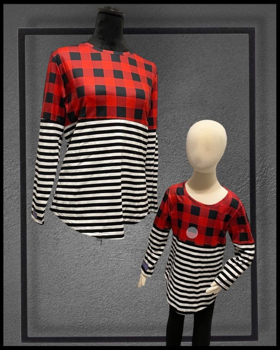 Coordinate in style with your child with the "Plaid with mommy" outfit. This trendy and comfortable ensemble allows you to match with your mini, fostering a unique connection. Create a matching look with your little one by choosing this fashionable and playful plaid set, paired with black leggings for a casual outing. (Stretchy)