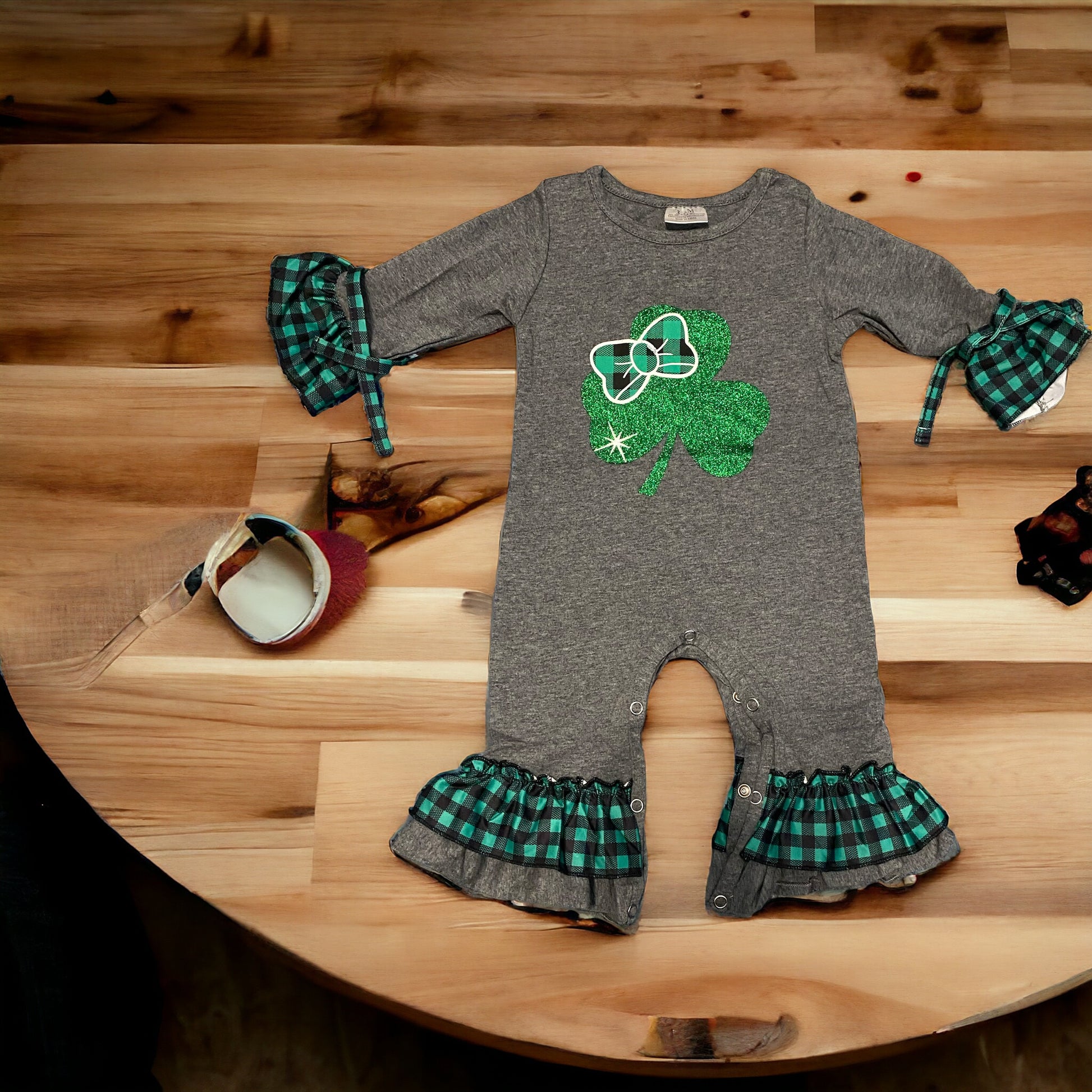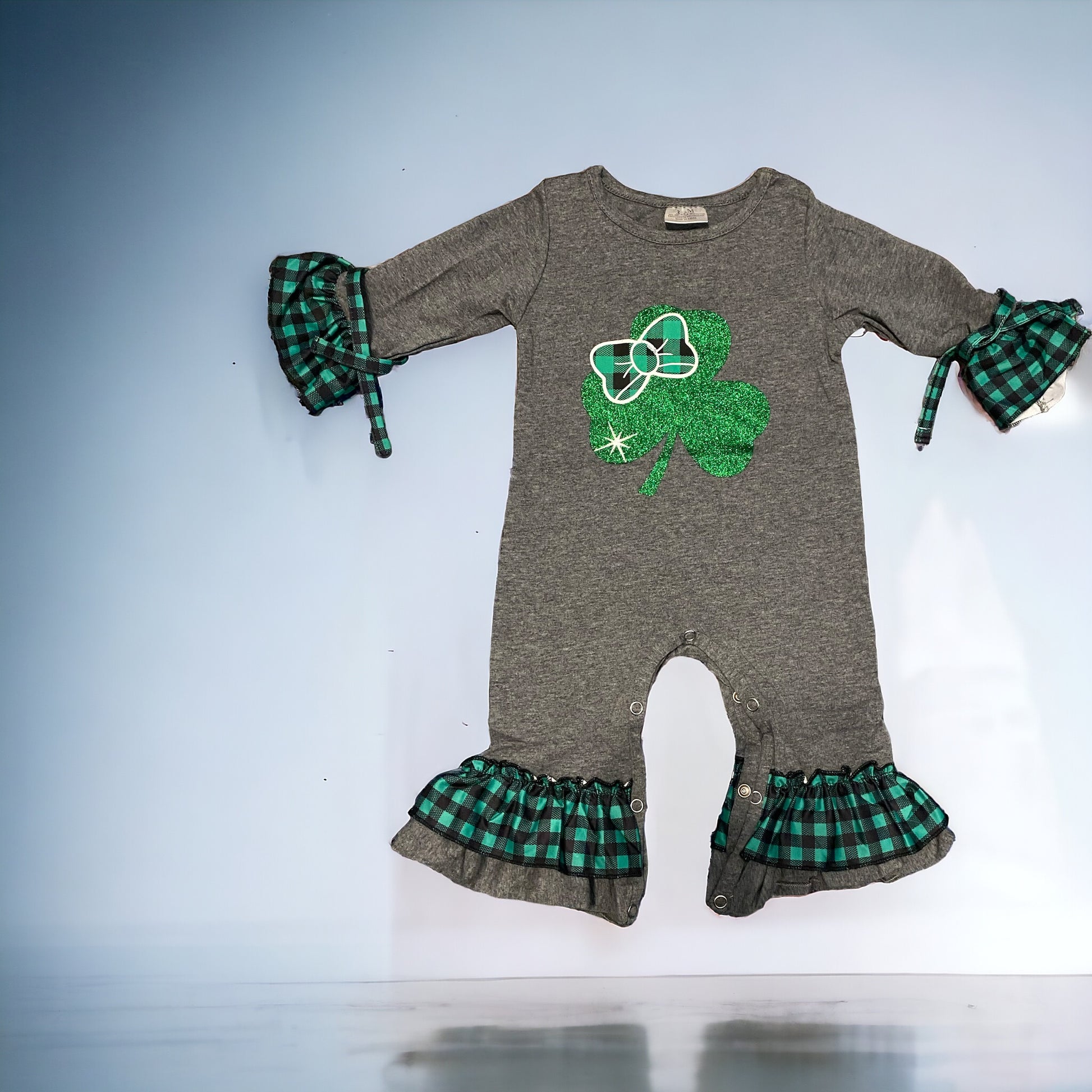 Dress your little one in this charming shamrock romper for an adorable St. Patrick's Day look. Made with soft, comfortable fabric, this onsie features a festive shamrock design. Perfect for celebrating the holiday in style.